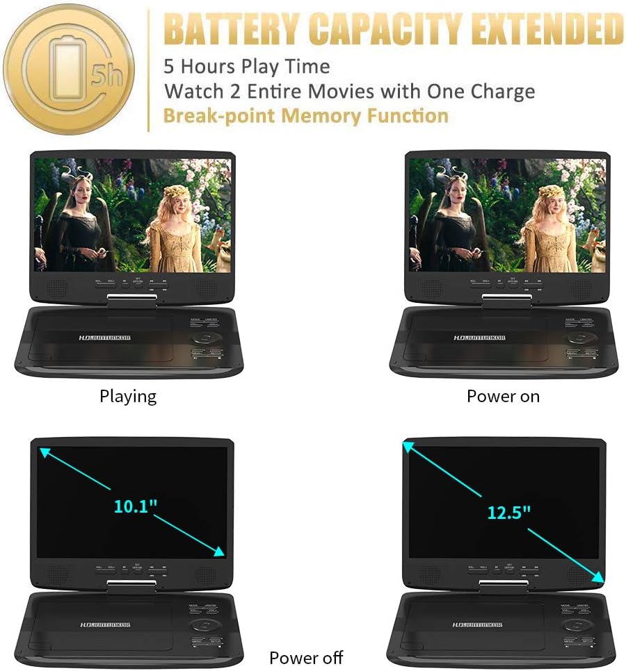 Pure HD Cinema Level Screen Brand-new self-produced LCD screen has more high-definition and top picture quality. Upgraded 10. 1-Inch 1024*600 swivel screen with 270-degree rotation and 180 degrees flip allows you to get the perfect view every time. We provide 1-year technical support services. Longer Watching Time Adds a protection board for the battery to achieve the highest quality and safety. You can enjoy your favorite videos for up to 5 hours without charging. Additional charging option with the car charger and AC adapter ensures you can use it for longer anytime, anywhere. Unique Button Design The ONLY DVD player on the market that has two sets of operating systems, one for daily viewing, another for on-board viewing. With a Customized car bag, the Portable DVD Player for Car does not need to be taken out of the headrest mount bag when used in car, reducing the inconvenience during travelling. Supports Huge Array of Multimedia Supports direct play of CD, DVD, CD-R/RW, DVD -R/+R, DVD+RW/-RW, VCD, SVCD (but NOT blu-ray DVD). It is region free. In addition, it supports max 32GB USB and SD cards for playing MP3/WMA/WAV, JPEG, MPEG2/AVI. Break-point Memory Built-in break-point memory function means the DVD will begin where you left off last time. Perfect gift as valentines day gifts for kids and beloved.