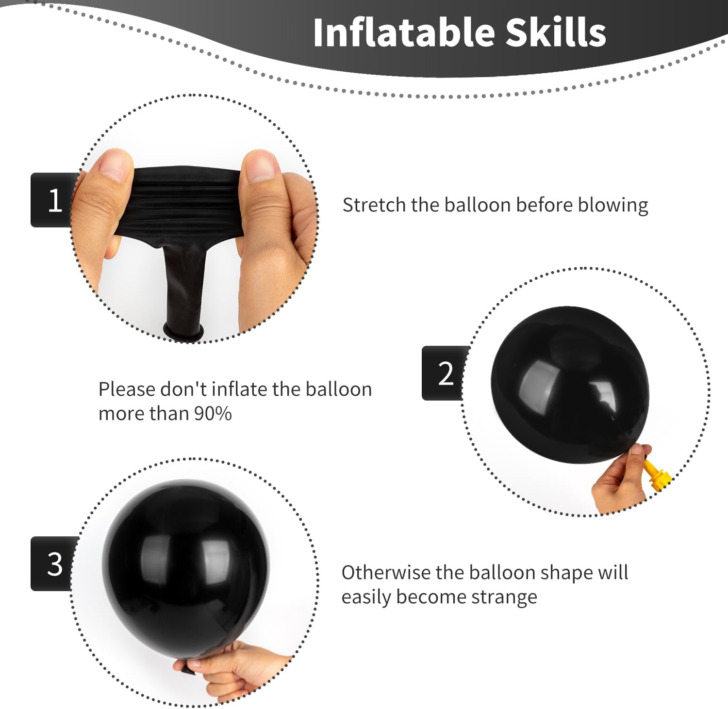 Black Party Balloons Arch Kit Package includes 140pcs Black Balloons - 18inch 5pcs, 12inch 30pcs, 10inch 40pcs, 5inch 65pcs and 5 sheet of adhesive dots(100pcs), 2 rolls of ribbon(32ft), 1 roll of balloon chain(16ft). Four Different Sizes of Mate Black Balloons can meet your needs for any style and shape the perfect balloon arch to make your party or banquet stand out. With these balloon decoration accessories, you can create a unique Halloween balloon arch and graduation balloons garland. Premium Quality Balloons Garland Kit Our Black Balloons are made from natural latex material which is durable and long-lasting with no smell, safe to use around children. Black balloon sets of different sizes are much more sturdy above regular balloons and after expansion, the Black Latex Balloon can stay in good shape for a long time, so you don't have to worry about them bursting before the party is over. These Black Balloons will be the highlight of an impressive and unforgettable party. Wide Application Black Party Supplies Different sizes Matte Black Balloons are not only suitable for graduation ceremonies, celebratory, gender reveal parties, baby girl boy's party, bachelorette, baby shower, bridal shower, wedding, engagement, birthday, anniversary activity, indoor and outdoor themed party garland decorations, but also for festivals decoration, like Halloween, Easter, Thanksgiving Day, Christmas, New Year's Eve, Valentine's Day, Mother's Day, Father's Day, Children's Day etc. Easy to Use We will provide you with glue dots, balloon decoration strips and ribbons as tools so that you can assemble the Black Balloon Arch Kit in no time. Latex balloons filled with AIR will stay full for up to 72 hours, while with HELIUM will stay full for 3-6 hours.For best float results, fill helium 1-2 hours before your event. Recommended to use with a balloon hand pump or electric balloon pump. DIY them with different sizes and colors of balloons for various styles and themes. Warm Tips Please do not inflate the Black Balloon above 90% to keep it in perfect shape for longer and take care to avoid sunlight, sharp objects and too much friction. The color of the balloon will be a little different before and after it is blown. There may be some latex odor when the Latex Balloons are taken out, you can dry it in a shaded and ventilated place, and do not place it in direct sunlight. Control the amount of air inflated into each balloon to achieve your ideal balloon size.