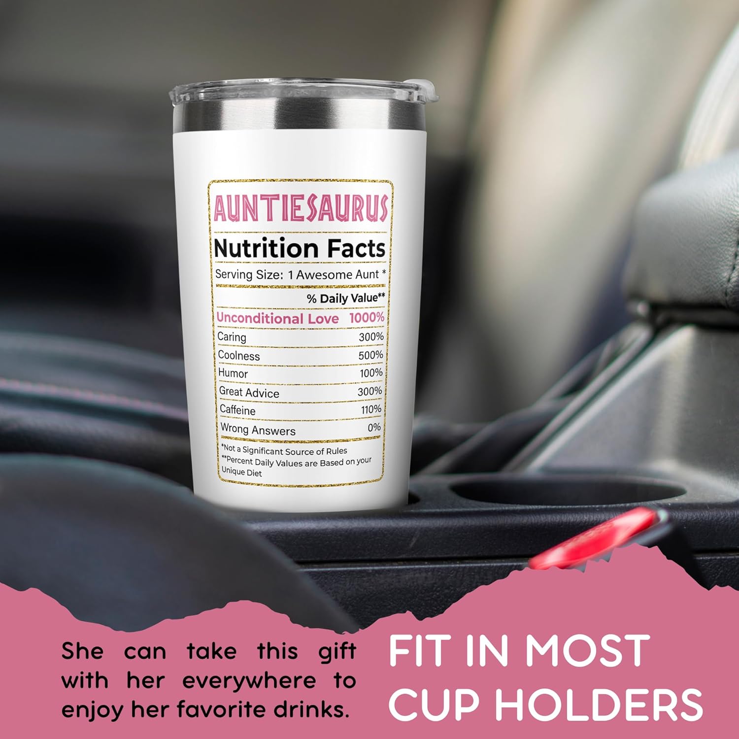 AUNT GIFTS: Create a hilarious moment for your Aunt with our Coffee Tumbler. She will definitely laugh so hard when drinking coffee in this cup every day. Ideal for gifts for aunts, cool aunt gifts, gift for aunt from niece, gift for aunt from nephew, funny gifts for aunt, to be aunt gifts, gift ideas for aunts, auntie gifts for women, gifts for your aunt, gifts for auntie from niece, promoted to aunt, aunt pregnancy announcement, aunt presents,... GIFTS FOR AUNT ON ANY OCCASION: Let this Aunt Coffee Tumbler celebrate the important events in her life. Suitable for birthday gifts for aunt, valentine gifts for aunt, aunt valentine gifts, mothers day gifts for aunt, mother's day gifts for aunt, or aunt christmas gifts, christmas gifts for aunt from niece, christmas gifts for aunt from nephew, and any normal day that you want her to feel loved. WIDE RANGE OF APPLICATIONS: Our Aunt Gift Tumbler fits into most cup holders. Used for both outdoor and indoor use like working, exercising, backyard barbecues, picnic, hiking adventure, RV tour, beach outing, fishing trip or in any daily activity. SPILL RESISTANT & DURABLE DESIGN: Come with a clear, push-on lid and crafted with 18/8 food-grade stainless steel, this Tumbler for Mom is unbreakable, sweatproof, rust-resistant, portable, and excellent for morning coffee or to regularly drink out of. DOUBLE WALL VACUUM INSULATION: Made with double-wall vacuum insulation, this Aunt Mother Tumbler can keep your favorite beverages hot for 8+ hours and cold for 12+ hours in normal temperature environment. Hold hot coffee, iced cold fruit teas, wine tumbler,... without affecting your drink s natural taste