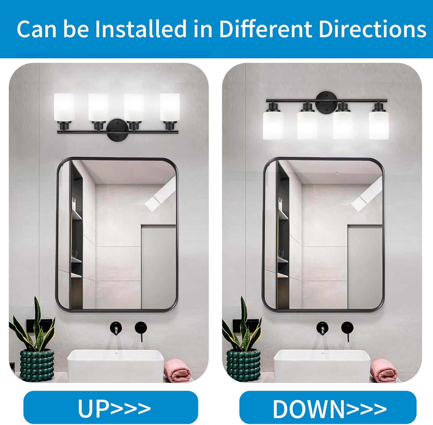 Outstanding Durability - Build with rustproof mental materials and adorned with matte black finish, 4-light bathroom light fixtures exhibit resistance to rust and corrosion. Engineered to endure the moisture-laden atmosphere of bathrooms, they ensure prolonged durability and reliability, sparing you the inconvenience of frequent replacements. Eye-Protection Lampshade - Crafted from milky white frosted glass, these bathroom lights feature lampshades designed to gently diffuse light, ensuring eye protection by eliminating glare and minimizing strain. Perfect for tasks like makeup application and grooming, they improve comfort and visibility, allowing for extended use without causing eye fatigue. Wide Application - Vanity lighting can be installed with the light facing upward or downward. It serves as an ideal decoration for various spaces, including the bathroom mirror, bedroom, entryway, living room, stairway, porch, cabinets, dressing table, closet, and more. It offers a perfect decorative touch for your home and other locations. Easy Installation - The modern bathroom lights are designed for easy installation, including all essential mounting hardware. With a standard length of 24.6inch, they are well-suited for most bathroom spaces. We recommend wearing gloves during installation to prevent scratches. If you are unsure about the installation process, please consult a qualified electrician.
