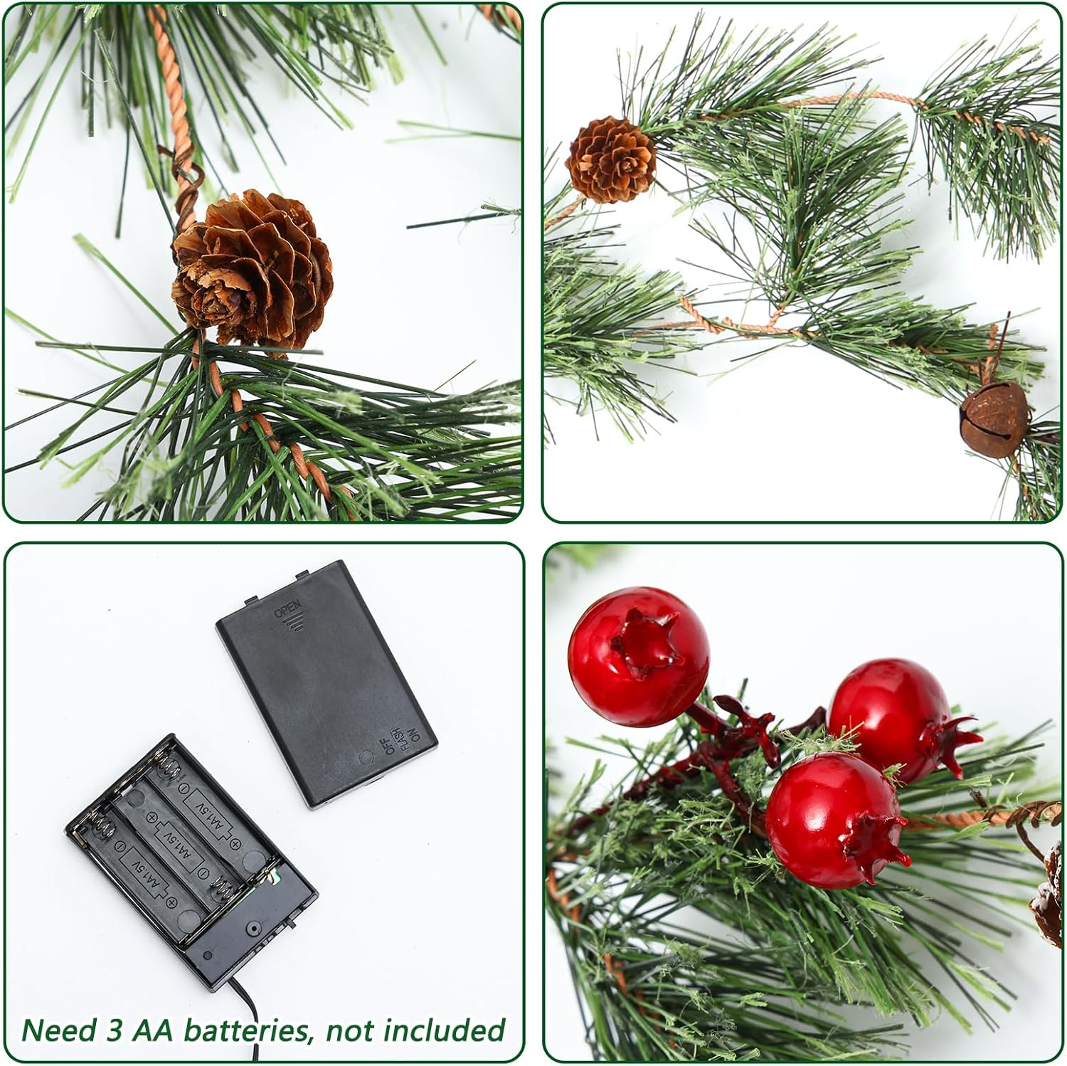 Realistic Winter Smokey Pine Garland: Our Christmas garland features pine cones, Christmas bells, red berries and pine needles. It looks very incredibly real, making it the perfect addition to your winter decor. Package Included: 2pcs Christmas garland with smokey pine, 1pcs 50led string light (Need 3 AA batteries, not included). The smokey pine garland is 6 feet long. It's perfect for modern farmhouse decor. Versatile Decoration: You can use the Christmas garland to decorate your mantel, dining table, chandelier, front door, staircase, TV cabinet, or anywhere else you need a touch of winter charm. Easy to Shape: The Christmas garland is made of plastic. It is lightweight and easy to shape, making it easy to create the perfect look for your space.