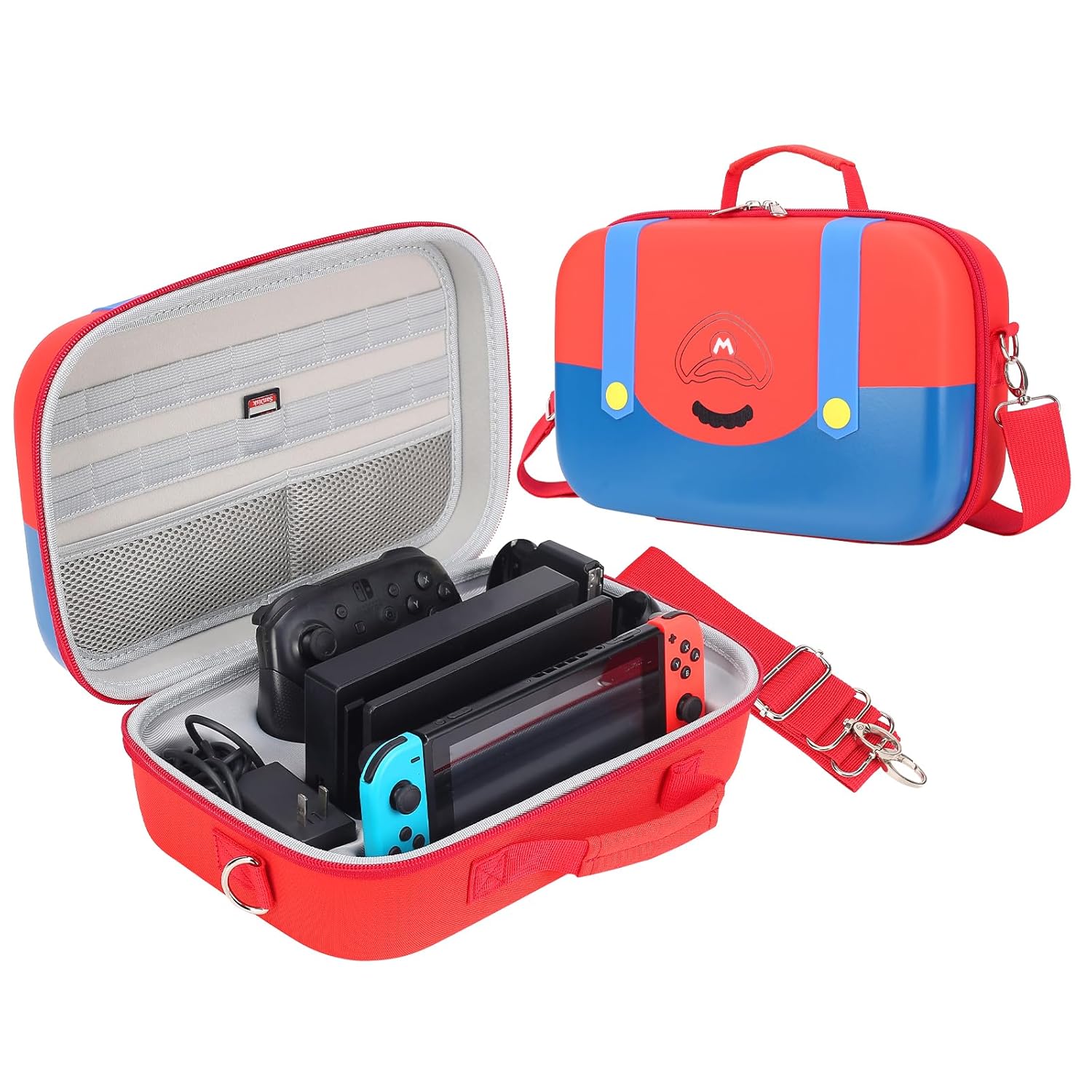 Cute Switch Carrying Case: Hard Shell Case is specifically designed for Nintendo Switch Console / Switch OLED Model(2021), the customized slots is perfect fit for Nintendo Switch Accessories. Awesome as a gift, stylish and elegant design which make it outstanding. Comprehensive Storage Environment: Large storage is suitable to take all the Switch accessories when go on a trip. Fit for Nintendo Switch Console/Switch OLED Model(2021), Switch Dock, AC Adapter, Pro Controller, JoyCons Grip. With a mesh pocket can holds other smaller accessories like extra Joy Cons, USB Cable, Joy Cons Straps etc. Lightweight, Hard and Skid-proof Case: Soft PU leather with thickening hard EVA, It provides a full range of protection for Nintendo Switch, it s not only easy to store Nintendo Switch Console indoors, but also can be fully prepared for outdoor activities. This storage case is portable, anti-fall and anti-stain. Professionally Protective Interior: Soft fabric and specially tailored groove are to avoid damage caused by bumps and fall, prevent your nintendo switch from colliding and scratching with other switch accessories, so it has no wiggling in separate interior space. Smooth and durable material protects the Switch from everyday wear and tear. What You Get: 1x Mario Carrying Case for Nintendo Switch (For sale is case only, Nintendo Switch and accessories are not included.)