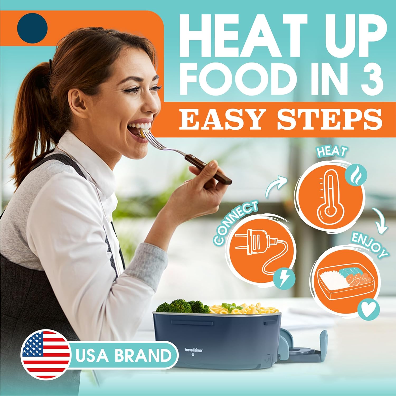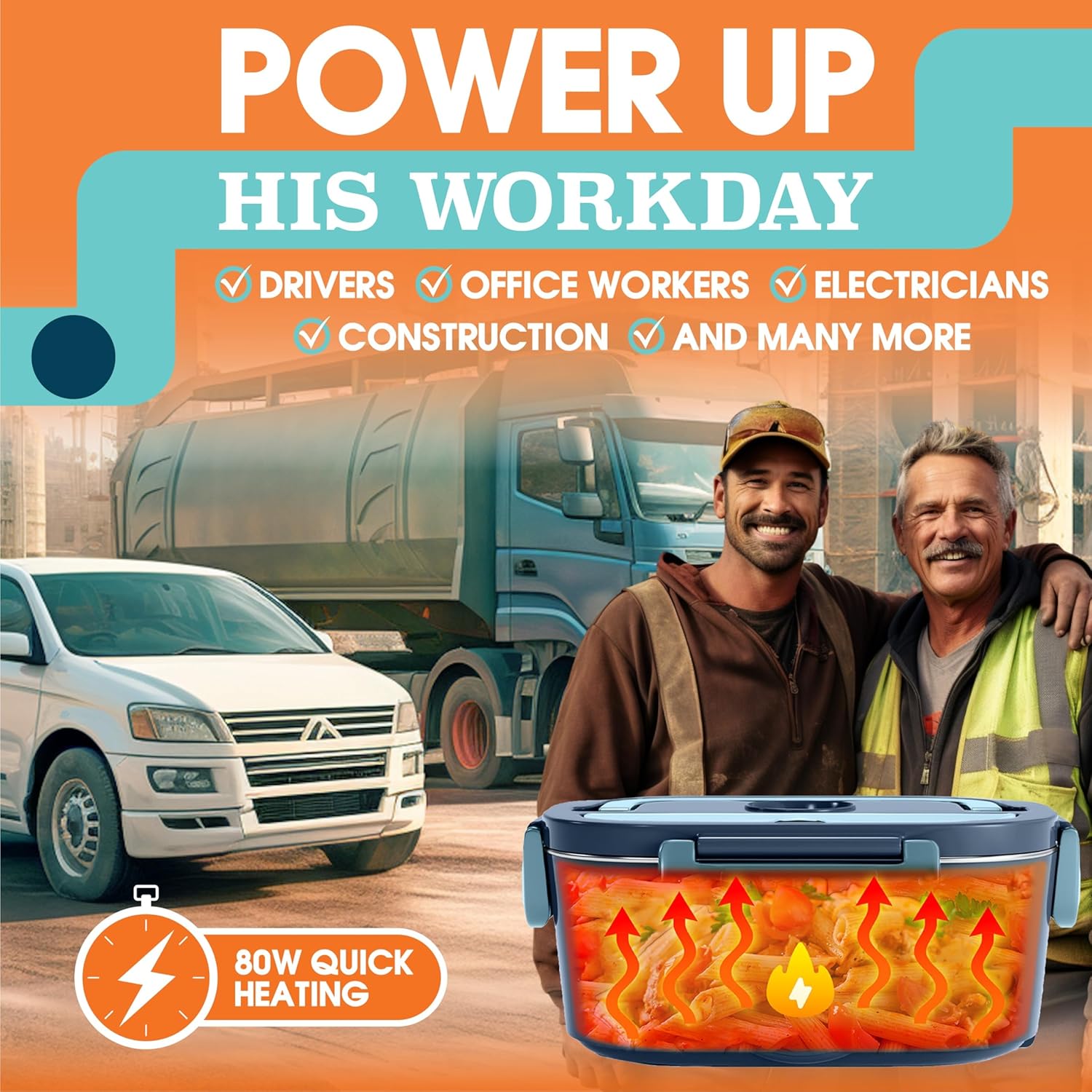 HOT AND HEALTHY FOOD ANYWHERE Relish hot, homemade meals on the go with our food warmer lunch box. This lunch warmer portable for work is a healthier alternative to cold or fast food and makes excellent gifts for men and gifts for women who value convenience and nutrition. VERSATILE 3-IN-1 PORTABLE WARMER - Our heating lunch box for men and women adapts to your needs with voltage settings (110V, 12V, 24V), our portable food warmer suits cars, trucks, or office desks. Savor homemade meals effortlessly. QUICK SELF-HEATING - Experience quick meal heating with our 80W electric lunch box for men, warming your food in just 20-30 minutes. Enjoy swift and homemade hot meals anywhere, no portable heating lunch box for men or office required! PEACE OF MIND DINING - Crafted with stainless steel, our hot lunch box for adults ensures food hygiene. Enjoy peace of mind with materials that prioritize safety. EFFORTLESS CLEANUP & GENEROUS SIZE - Worry-free meals with our heated lunch box for men and women. Featuring a generous 1.5L capacity, this heatable lunchbox is perfect for carrying ample portions. Dishwasher safe, cleaning is a breeze.