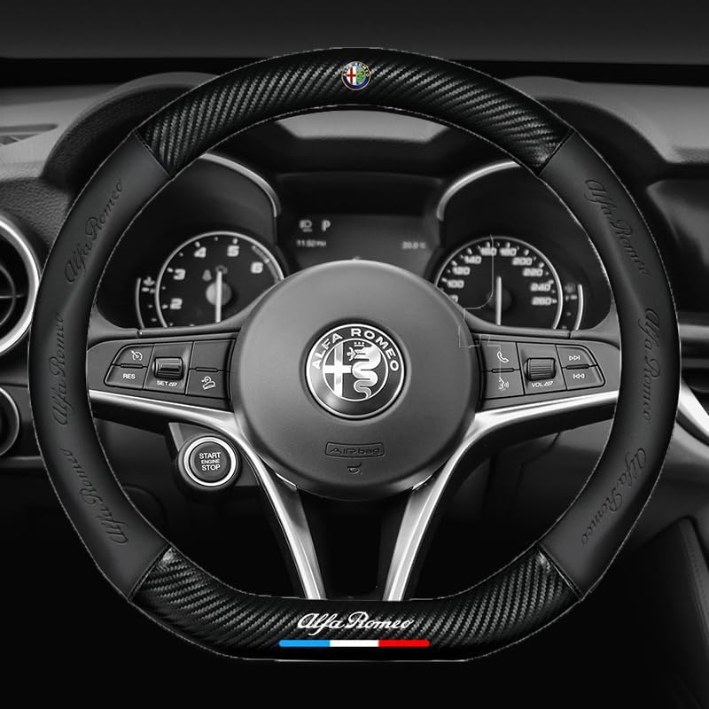 Title: for Alfa Romeo Steering Wheel Cover Custom-Fit, Fusion Carbon Fiber Premium Leather Cover with Emblem Logo Car Steering Wheel,Designed for Alfa Romeo Car Accessories (AEF-Old)