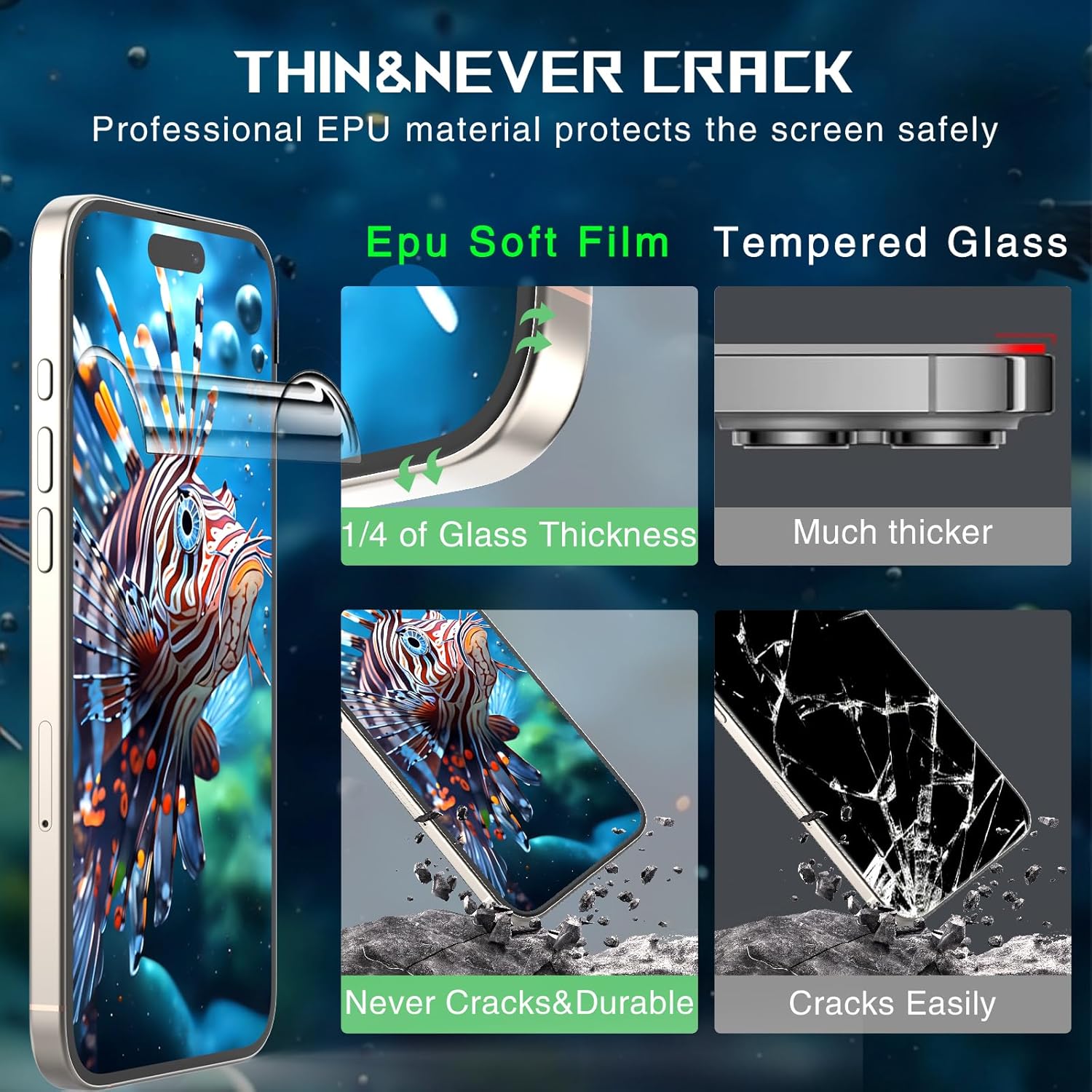 Thin&Unbreakable: The iphone 16 Pro Max screen protector is only 1/4 the thickness of a tempered glass film, but offers the same protection as tempered glass. The difference is that it never cracks so you don't have to keep replacing it Flexibility and Impact Protection: Nano-coated surface resists cracking, chipping, scratching and absorbs shocks and bumps from everyday use. It bends, not cracks or chips. It stays in shape and is much safer because it won't break or shatter like glass Self-Healing: Our screen protector is made of flexible EPU material, the tiny scratches and bubbles normally disappear after 8 hours. Premium EPU protects your iphone 16 Pro Max well from unwanted scuffs and scratches by keys and some other hard substances NON-Breakable: Exceeding the industry's most stringent testing standards, the EPU soft film protects 1685M+phone users' screens from breakage High Definition and Bubble Free: 99.99% high definition and 99.99% clarity for maximum resolution. Premium soft EPU material and precise cut-outs provide complete bubble-free protection while maintaining original responsiveness and clarity Note: Please select the model you need before purchasing Pro tip: Due to the light refraction of the specially coated privacy film, it is recommended that you increase the screen brightness after installing the privacy film