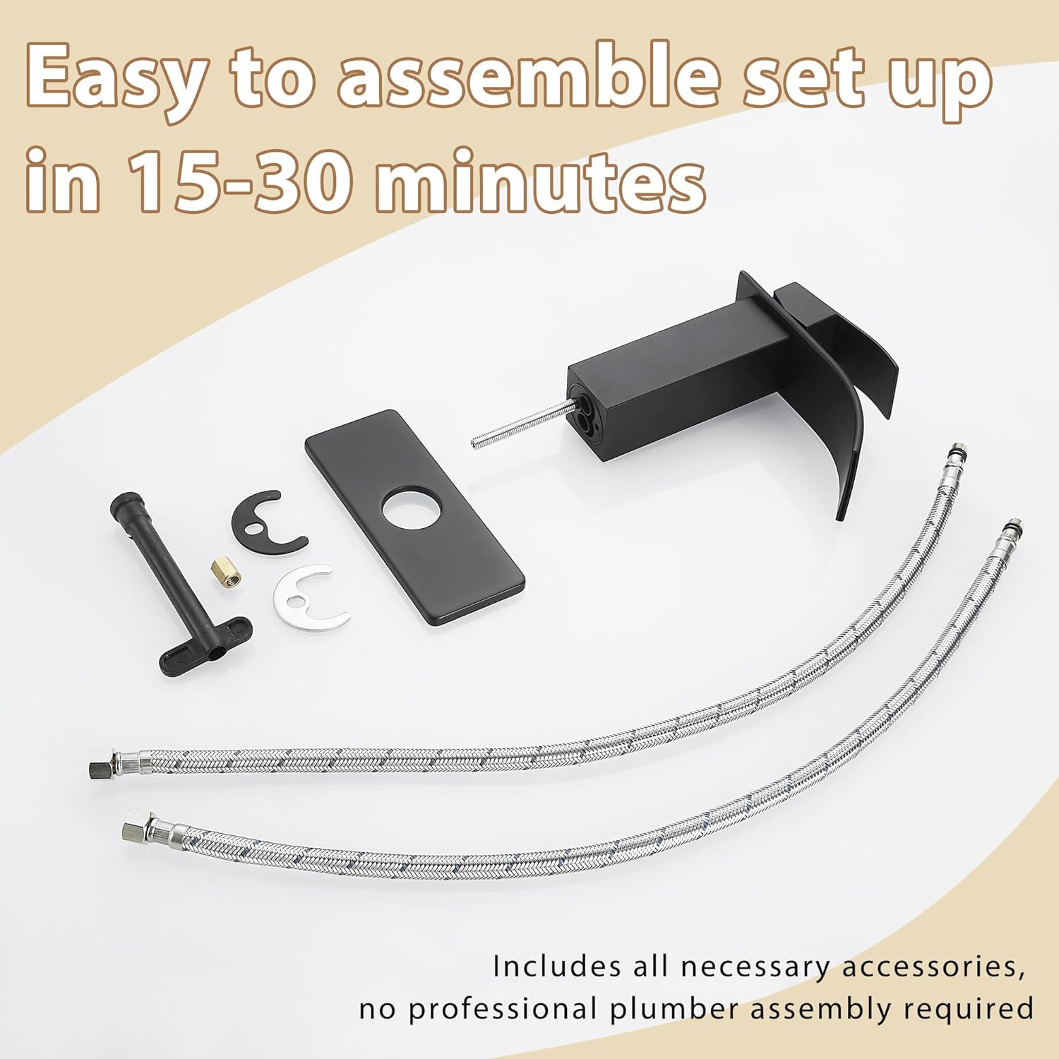 Easy to Install: Bathroom faucet is easy to install and clean. And the waterfall spout includes 2 pcs 60cm water supply lines, deck plate, hardware Durable Matte Black Finish: Matte Black construction can meet the daily use and achieve the purpose of corrosion resistance and provides a lightly brushed warm grey metallic look. One Handle Modern Design: One handle style can control water and temperature easily. The single lever is designed for ease of use for water flow and temperature adjustments. Strong Compatibility: It is compatible with 1 or 3-Hole installation, the retro waterfall style is perfect for your bathroom