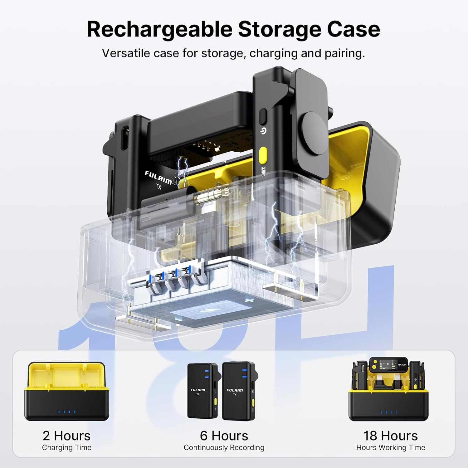 Plug and Play: The FULAIM X5 wireless lavalier microphone system comes with three types of connection accessories: iPhone adapter, TYPE-C adapter, and 3.5mm camera audio cable. It is widely compatible with iPhone, iPad, Samsung, Android phones, cameras, laptops, tablets, and computers. Simply plug and play; the devices automatically pair when turned on. It supports transmission ranges of up to 200m (656ft). 9-Hours Audio Recording: With built-in 4GB memory on the transmitters, the X5 wireless microphone set can record up to 9 hours of uncompressed 48kHz 16-bit audio. This feature allows for sound backup during shooting. Use the included TYPE-C cable to quickly transfer audio files to your computer. Portable Charging Case: The included charging case makes shooting more convenient and easier. When fully charged, the case can recharge the entire microphone kit twice. Each transmitter and the receiver can operate for 6 hours, offering up to 18 hours of total recording time. The case features a weak-magnetic design, automatically calibrating and charging the transmitters and receiver once placed inside. Magnetic Attachment & DSP Noise Reduction: Magnetic accessories are designed for the metal X5 TX, allowing easy attachment to clothing or other objects. Its discreet and hideable design is perfect for coordinated recording, making it flexible and convenient in any environment. Equipped with DSP sound and noise processing technology, this clip-on microphone delivers clear 48kHz 16-bit sound without audible noise. Real-time Sound Monitoring & 3 Audio Output Modes: The receiver features a 3.5mm headphone jack and sound gain-control design for superior sound output, enabling real-time monitoring and optimization of sound signals during recording. It also supports playback even when the RX is plugged into your device. The wireless mic offers three audio output modes: Mono and Stereo for easy editing, and Safety Mode to eliminate pops and prevent sound loss. Easy Operation with TFT HD Display: The receiver's TFT HD display clearly shows all essential information about the microphone and transmitters, including volume, battery life, and current recording mode, ensuring you can monitor the recording progress effectively.