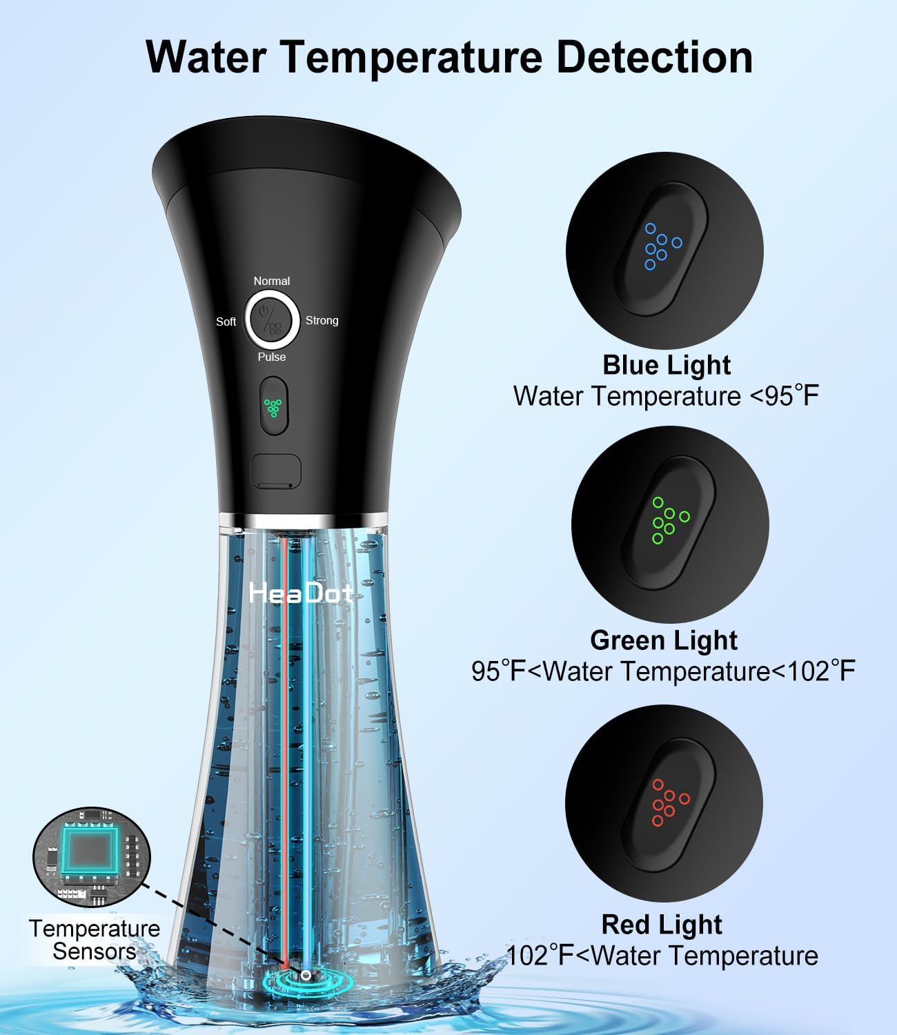 Safe and Effective Earwax Remova - Headot's ear wax removal tool is an innovative product specifically designed for optimal ear canal health. Experience a safe, efficient, and gentle solution for cleaning your ear canal. Enjoy the soothing sensation of an ear canal massage anytime, anywhere. Four Water Pressure Modes - Our electric ear cleaner offers four different pressure intensities (Normal, Soft, Strong, Pulse) to ensure thorough rinsing while protecting your ear canal. Simply select the appropriate intensity for a comfortable rinsing experience. Integrated Dual Tank Design - Our ear cleaning system features an innovative integrated dual tank design, providing a more convenient and hassle-free ear cleaning experience. Unlike traditional ear washers that require you to rinse while trying to catch the dirty water with another hand, our ear washer is equipped with a clean water tank and a separate tank for collecting the dirty water, making the cleaning process effortless and efficient. Intelligent Water Temperature Detection - Our ear cleaning kit incorporates an intelligent water temperature detection system. A green light indicates the proper water temperature, a blue light indicates low water temperature, and a red light indicates high water temperature. This ensures your safety and comfort throughout the ear cleaning process. How to Use - We recommend adding warm water close to body temperature for optimal use. Cold water may cause dizziness, so it's important to avoid it. If you encounter any issues with your product, please don't hesitate to contact us. We are dedicated to providing exceptional customer service and support.