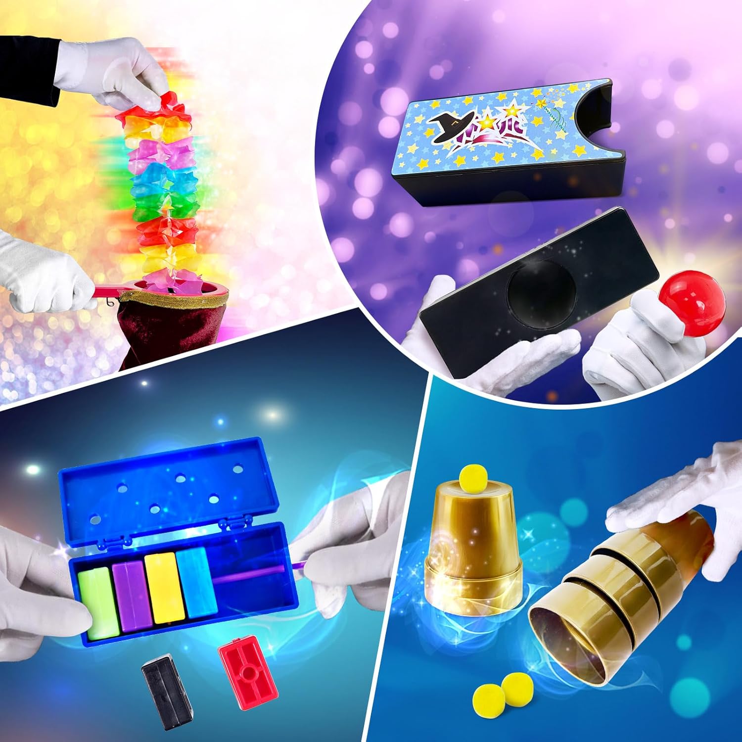 Learning & Education Magic Props This magic set features in dozens of classic and upgrade magic tricks, including Disappearing Ball, Magic Coin,Magic Number Prediction, Vanishing Coin and Magic Trick Bag and so on. Step-By - Step Instructions Come with easy to follow illustrated instructions for each trick for kids to perform, children can learn how to perform follow the one by one steps. Magic Toys Made of high quality material, safe & environmentally friendly props toys. Designed for young hands to ensure they will not hurt your child. Gift for Beginners Includes different levels of tricks and adds several Funny and entertaining magic tricks, it is perfect for kids and beginner magicians. No worries about your child getting bored with this exciting magic kit with hours of engaging learning and dozens of entertaining tricks to perform. Hours of fun: Easy to use for young children and will provide hours of fun and enjoyment whilst also encouraging them to learn as they play, train their self-confidence and concentration while playing.