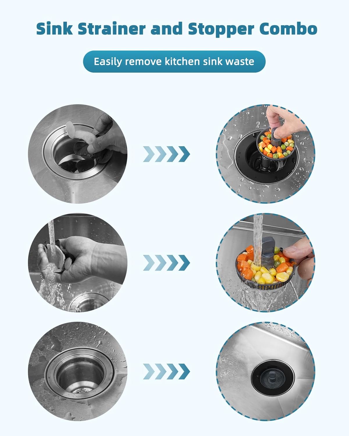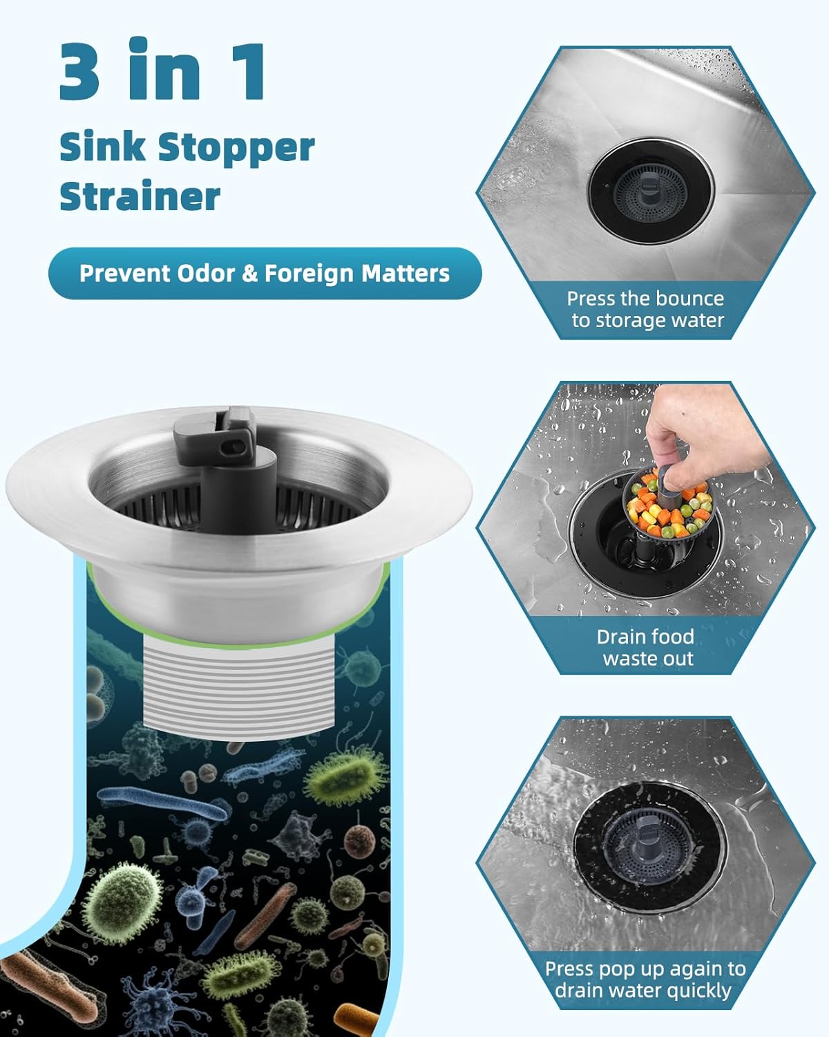 Superior 3-in-1 Design: This sink drainer combines both a filtration basket and a sink plug in one; Has an integrated deodorizing function that combats odor within the sink, providing multiple practical uses Leakless Sink Drain Stopper: The bottom is made of stainless steel, robustness, rustproof, and anti-scratch; By pressing its spring-loaded handle, you can effortlessly trap water for zero leakage assurance Universal Pop-up Drainer Stoppers: Optimal fit for American standard 3-1/2 inch drain hole size, suitable for most kitchen sinks; Please confirm the size/diameter of the sink drain and type before purchasing Efficient Solution for Sink Clogs: Crafted with high-temperature-resistant thickened ABS material, our drain basket mops up food debris before it obstructs pipelines; The folded handle can easily take the waste out, preventing severe plumbing issues Say Goodbye to Cluttered Pipelines: Equipped with dual rubber ring for best sealing around the drain, avoiding any unwanted leaking and preventing clogging; Aims to alleviate your everyday kitchen struggles, providing you with a cleaner kitchen