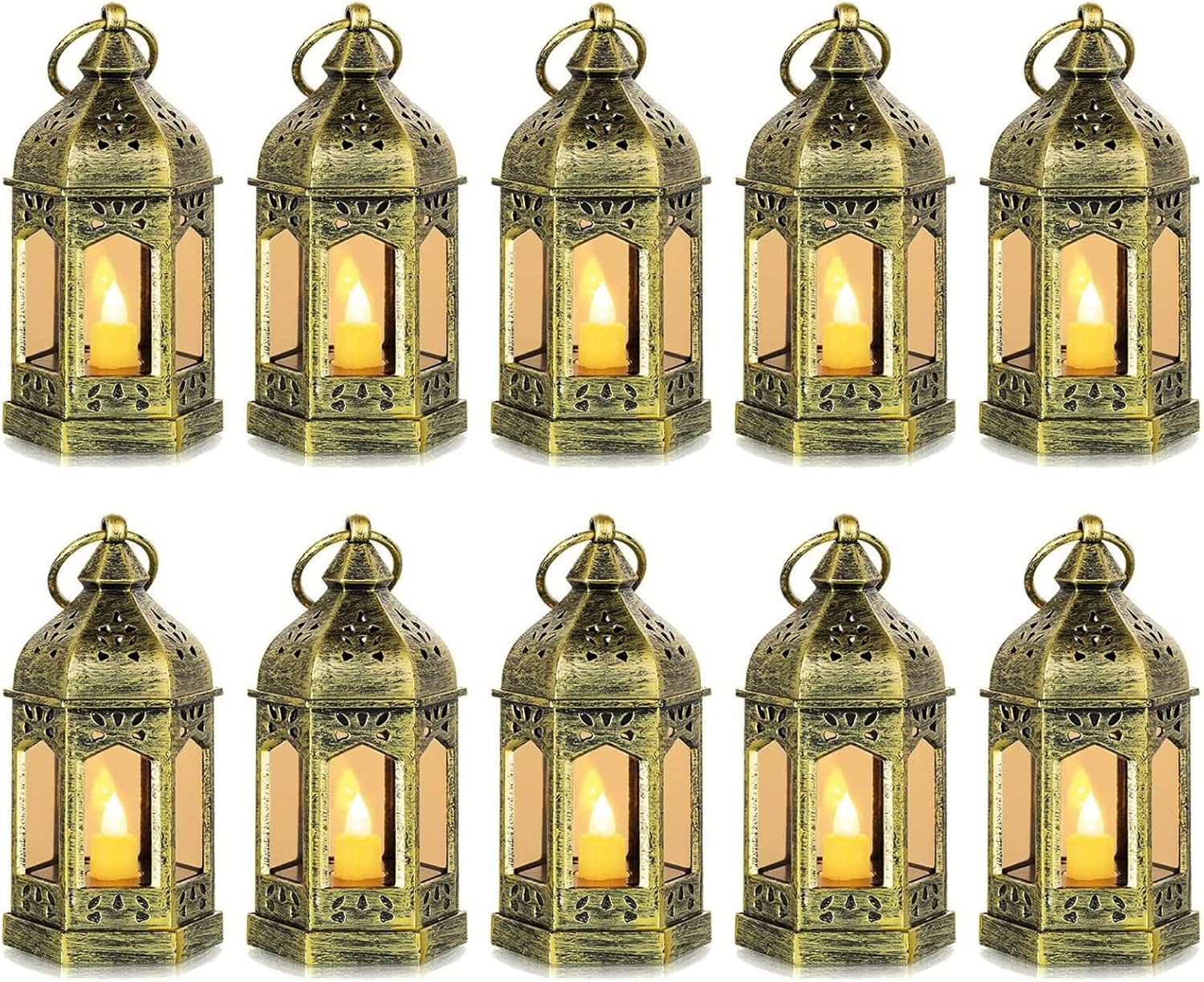 DELICATE MINI LANTERN: Small and cute hexagonal Moroccan style lantern candle holder is made of durable plastic with 6 clear glass panels. Inside there is a small and delicate flameless candle light. You no longer have to worry about bad smells and burning risks. FLICKERING CANDLES: Gold decorative candle lanterns wedding centerpieces flicker like real candles, but have no fire or smell, no fire hazard or risk of burning. They will provide warm light and create a warm, romantic and elegant atmosphere. BATTERY INCLUDED: Each electric moroccan lantern small contains 3 AG13 LR44 coin cells (included), allowing the mini light to last for more than 120 hours. Just remove the white insulating sheet on the bottom to turn on the flash! Great gift idea for any occasion. EASY TO USE: There is a switch at the bottom, which can be turned on or off quickly and easily. There is a pendant on the top, which makes it not only can be placed on the dining table, but can also be hung anywhere. The gold wedding lanterns bulk are essential decorations for weddings, parties, homes, kitchens, restaurants, gardens, Halloween, Christmas, etc. Make your home decoration more charming. NOTE: You will get 10 gold small lanterns decorative bulk, please pull out the white insulating sheet on the bottom to turn on the flashing lights before use. If you are not satisfied with our battery decorative lantern bulk, please feel free to contact us and we will do our best to make you 100% satisfied.