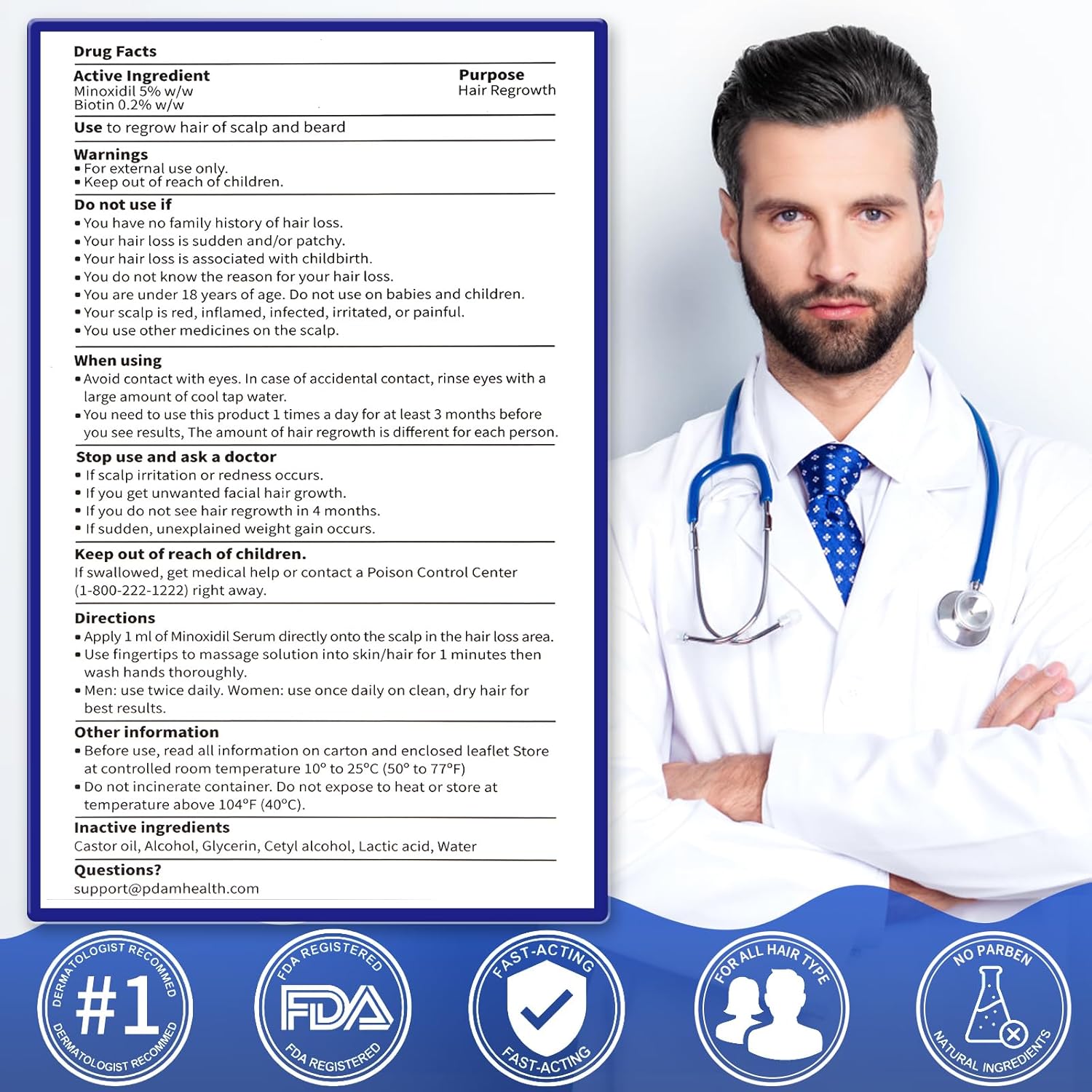 TOPICAL MINOXIDIL SOLUTION FOR IMPROVING THE THINNING HAIR:This is the #1 Dermatologist Recommended formula for improving hair loss and rejuvenating dying hair follicles. It not only maintains hair density and promotes healthy regrowth for fuller and more vibrant hair but also caters to various needs like hair beard growth to use minoxidil for men. It's a comprehensive topical minoxidil serum for all your hair concerns and restore your confidence in with our pdam minoxidil for women hair growth. SAFE & EFFECTIVE:5% Minoxidil & Biotin give extra strength to your follicle and reduces hair loss by revitalizing the hair from the roots and repairing split ends and promotes hair regrowth while maintaining a healthy, conditioned scalp for men and women. This powerful combination also boosts and stimulates hair beard growth for men. The main ingredient of this minoxidil hair growth product is an effective ingredient to regrow noticeably thicker and fuller hair and beard growth. ACCELERATE NATURAL HAIR BEARD GROWTH:Our hair growth serum is designed to revitalize, strengthen, protect, and stimulate hair follicles. The minoxidil for women strengthens thinning and weak hair resulting in noticeably thicker, fuller, and healthier hair. It provides noticeable results within a mere 8 to 12 weeks. Available in a user-friendly topical minoxidil solution format like minoxidil drops and in liquid minoxidil serum, it's specifically crafted to seamlessly fit into your daily routine. Suitable for Those People:This professional minoxidil hair growth treatment is suitable for both men and women and not irritating to the scalp. It's perfect for those who need to hair beard growth faster, people with thinning hair, pattern baldness, inelastic hair, and brittle hair. This powerful combination of minoxidil and biotin helps beard and hair regrowth. NDC 83767-301