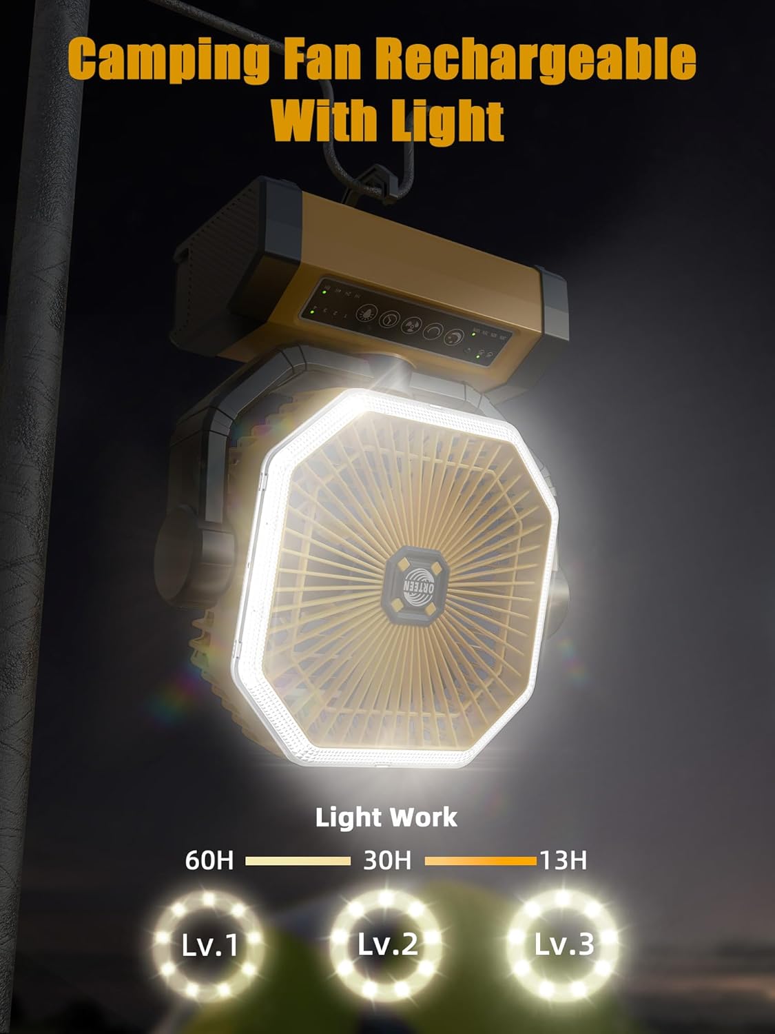20000MAH BATTERY POWERED FAN: This portable fan battery operated is equipped with a 20000mAh rechargeable battery with a working time of 14h-25h-40h-60h and four adjustable speeds, Allowing you to stay cool for a long time. In addition, The fan battery operated is equipped with Type-C input/output and USB output port, Which is convenient for charging the cordless fan, Making it a great choice for camping trips, Power outages, Hurricanes, Etc. RECHARGEABLE FAN CAMPING & SHAKING & REMOTE: This battery powered fan for camping has 90 or 45 automatic swing, 270 swivel head, which can be rotated at will to improve comfort. In addition, the portable fan for camping is equipped with a remote control, so you can easily control the fan with the remote control or buttons within 26 feet. The remote control can be stored in the slot on the side of the base to avoid loss. Note: Please remove the insulating strip on the remote control before use. USB FAN CAMPING WITH SLEEP TIMER: This rechargeable camping fan has a sleep timer to help you set the working time. The battery operated fan camping doesn't have to run all day or all night (can be timed to 1H, 2H, 4H, 8H). Also, you can set the sleep mode will turn off all the lights to help keep it dark and better sleep. Thanks to its powerful and super quiet feature, This portable battery fan runs with the lowest white noise (
