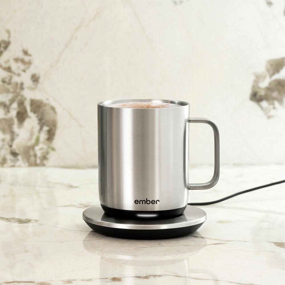 Ember Mug 2 Stainless Steel Edition is a brilliant new take on Ember's classic smart mug. Ember allows you to set your preferred drinking temperature (120 F - 145 F), so you can enjoy your hot drink-just the way you like it-from the first sip to the last drop. Ember Mug 2's built-in battery maintains your chosen drinking temperature for up to 1.5 hours, or all day with the included charging coaster. Capacity (oz.): 10 oz. Cleaning Instructions: Hand Wash Only. Color: Stainless Steel. Color Family: Stainless Steel. Drinkware Type: Beverage Mugs. Features: No Additional Features. Intended Use: Residential. Material: Plastic. Number of Pieces: 1. Occasion: Year Round. Package Type: Individual. Shape: Cylinder. Texture/Finish: Solid. Theme: Unthemed. Diameter (in.): 3.3 in. Product Depth (in.): 3.3 in. Product Height (in.): 4.2 in. Product Width (in.): 4.3 in. Capacity (oz.): 10 oz. Number of Pieces: 1. Cleaning Instructions: Hand Wash Only. Occasion: Year Round. Shape: Cylinder. Material: Plastic. Drinkware Type: Beverage Mugs. Intended Use: Residential.