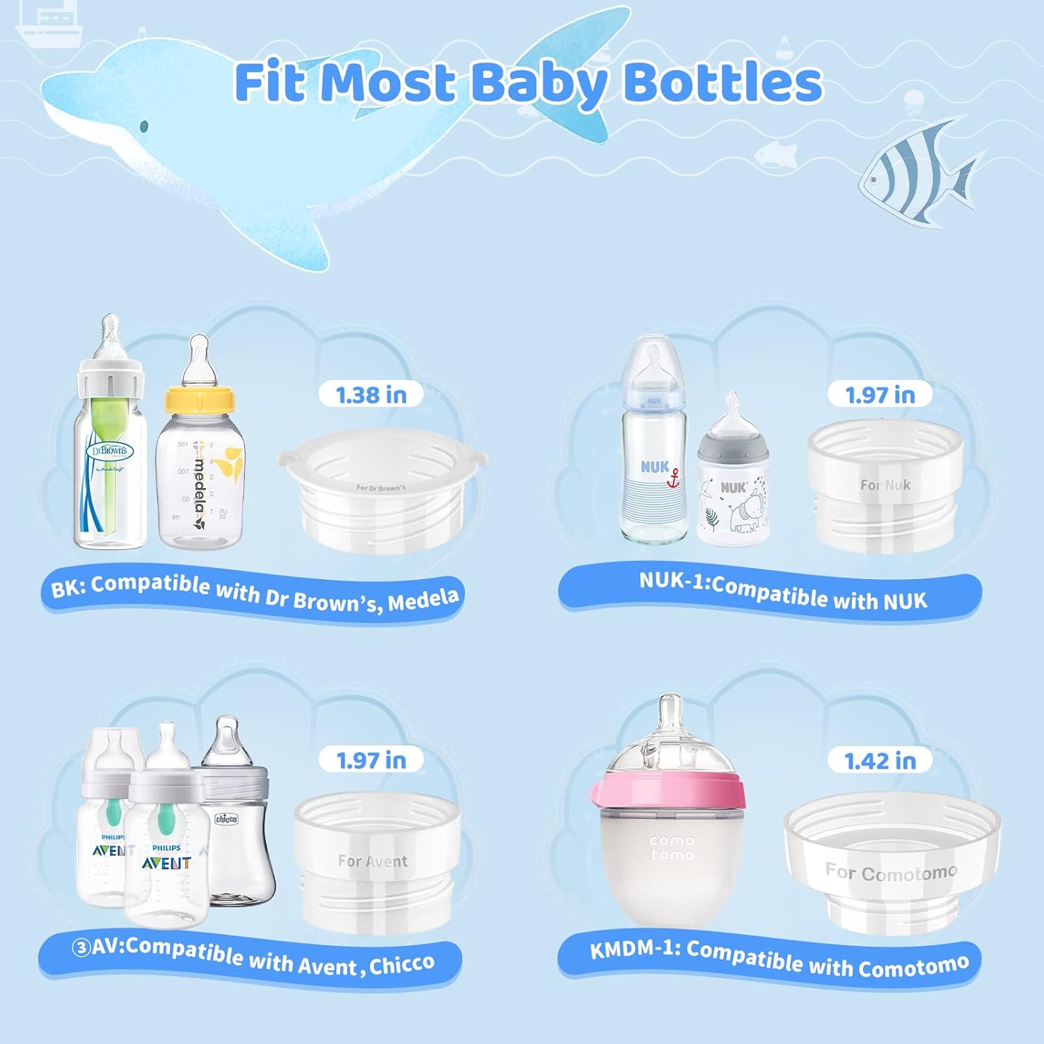 UNIVERSAL COMPATIBILITY: Our bottle warmer is compatible with most major bottle brands, including Dr Brown s, Philips AVENT, Medela, NUK, Chicco Comotomo, and more, Suitable as a baby shower gift. EASY AND QUICK WARMING: Enjoy quick and easy bottle warming with our sensitive temperature control sensor. Our bottle warmer can heat up your baby's milk in just 4 minutes, without the need to heat water first. PORTABLE AND CONVENIENT: Our portable bottle warmer is perfect for parents on-the-go. It's movable and automatically maintains temperature, and can be used wirelessly anywhere, anytime. Plus, with a long battery life, you can use it all day long! CUSTOMIZED TEMPERATURE: Choose from four temperature settings (98 , 104 , 113 , and 122 ) to heat breast milk, formula, or any liquid to your desired temperature. Our easy temperature selection options make it simple to use. UPGRADED DESIGN: Our upgraded design includes leak-proof silicone O-rings and a SUS316 stainless steel heating base. Simply screw your bottle into the baby bottle warmer or use it with a compatible adapter for safe and leak-proof use. Make sure to properly place and tighten the silicone O-ring to prevent spills. Our bottle warmer is made of durable stainless steel and easy-to-clean silicone, ensuring long-lasting use.