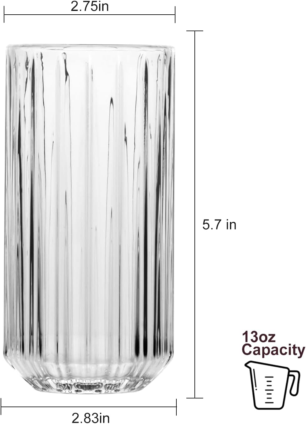 Visually Appealing Highball Glassware Set-Our stunning ribbed glassware set includes 12 tall glasses in securely package to prevent breakage during transportation,all made from premium quality clear glass,providing a classic stylish look,with a set of 12 packs you have enough glasses on hand for any occasions,perfect for causal entertaining or outdoor events. Vintage Ribbed Design-This ribbed glassware set features a sleek and stylish look that will impress your guests and add aesthetic appeal to your home bar or kitchen table,while the embossed ridges on the glass provides a better grip,making it easier to hold onto the glass and prevent it from tipping over,they are thick and durable so you can carry them with ease. Multiple Usage-Highball glasses are ribbed to add aesthetic interest and functional benefits,The highball glasses are perfect for serving a variety of drinks,juice,soda, lemonade,cocktail,iced tea,iced coffee,mixed drinks,smoothies and so much more. High Quality-Our functional drinking glasses are well crafted with premium thick and clear lead free glass,without harmful chemicals leaching into your drinks or beverages while in use,durable enough for daily use without any fear of damage or breakage,whether you want to serve a refreshing juice or sip a glass of whiskey,having a set of highball glasses is essential for your daily life. Size-2.75 inches at opening,2.83 inches at bottom base and 5.7 inches in height.