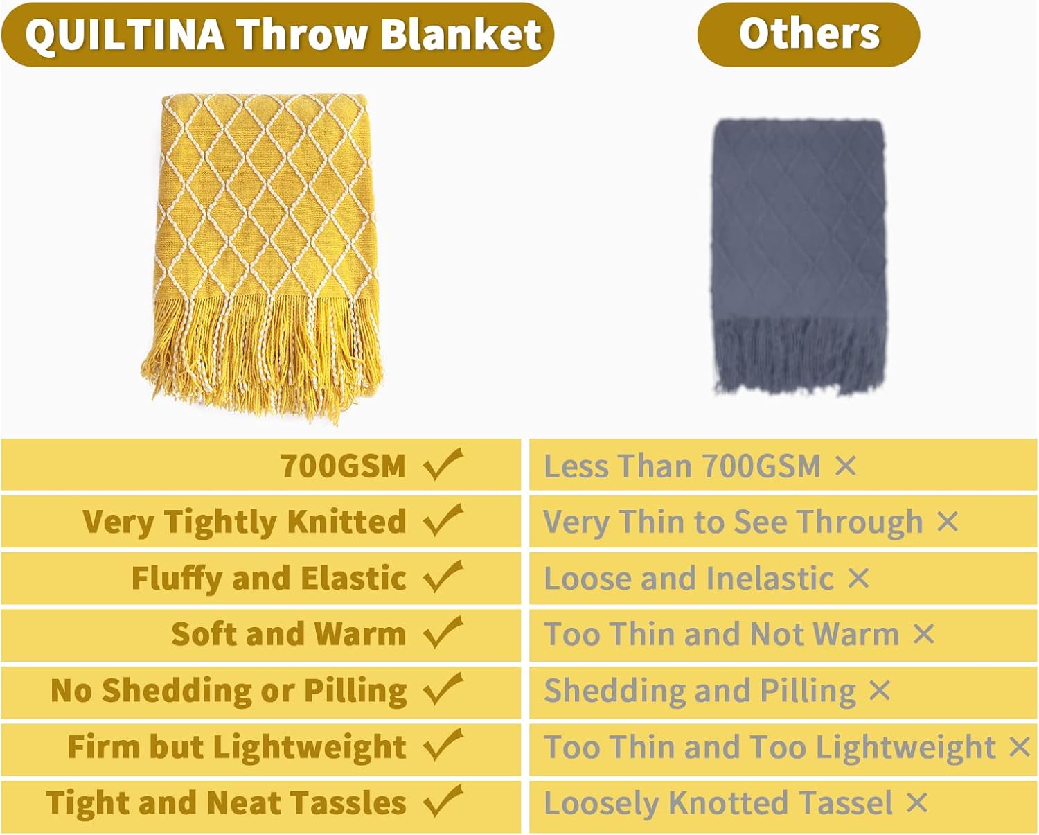Title: QUILTINA Bohemian Yellow Knitted Throw Blanket for Couch, 700G/SM Thick Soft Lightweight Warm Sofa & Bed Throw Blanket with Tassels for All Seasons and Decoration Use (50x64)