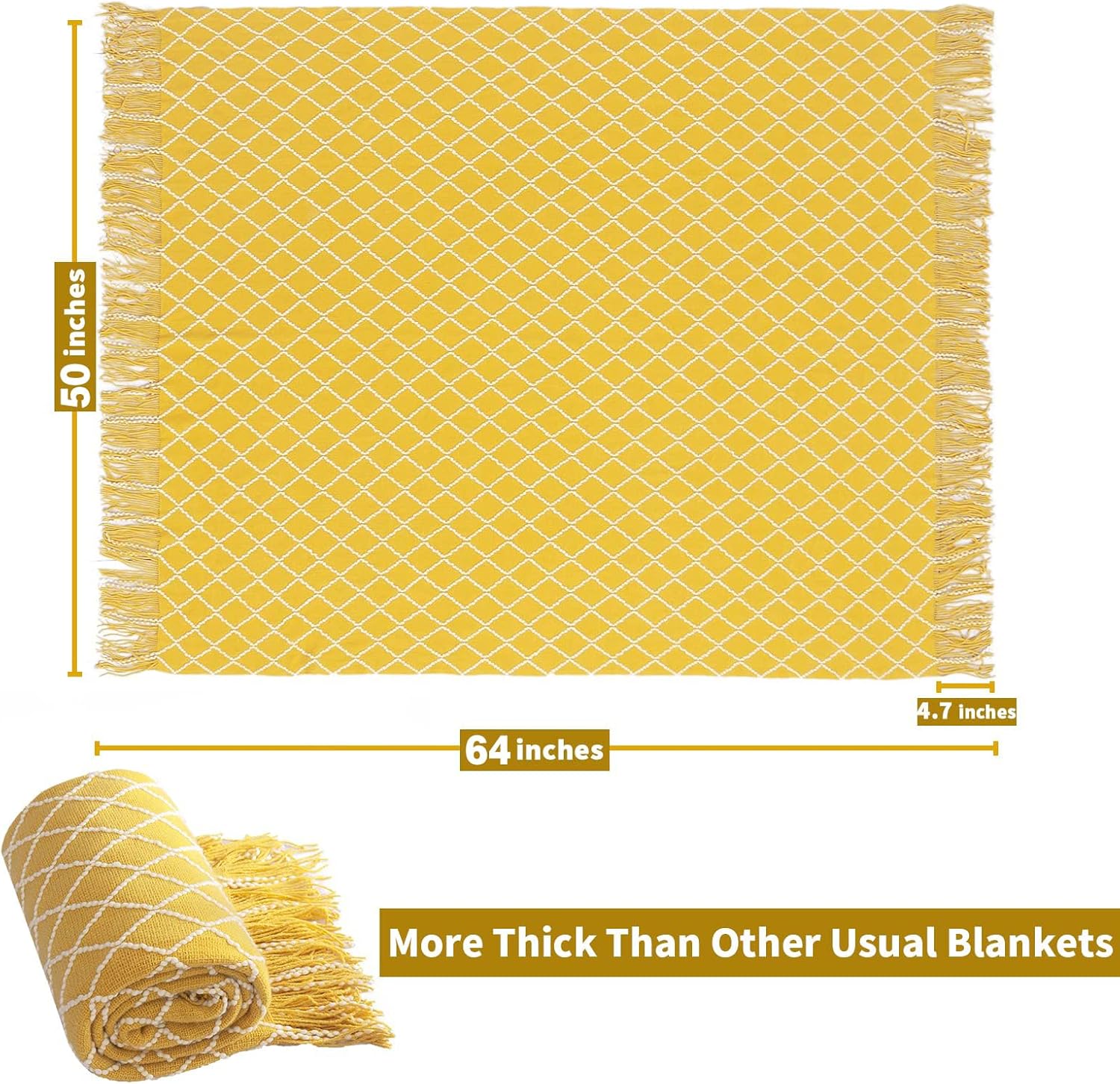 Decorative Knitted Throw Blankets Measures 50 x 64 Inches (tassels included), covers you more and provide warmer feeling. With a classic jacquard diamond pattern design with updated weaving tech, It is not easy snagging. This bed throw blanket is more than a blanket, it can also be a scarf ,a shawl and a sofa blanket for your home all seasons. 700GSM Tightly Knitted Tassel Blanket Compared with other lightweight but very thin throw blankets, our end of bed throw blanket weights 1.6 lbs which is lightweight but not thin. Thick enough farmhouse throw blanket with special acrylic yarn not only keeps you warm under air conditioner but also in freezing winter. This yellow throw blanket feels very comfortable and lightweight to carry everywhere. Soft Touch ALL SEASON Acrylic Throw Blanket Our knitted throw blanket is made of 100% acrylic, an environmentally friendly and renewable material with good wear resistance and stability. It's very soft and comfortable to the touch, and the texture is light enough to use as a blanket without any pressure. Indoor & Outdoor Throw Blanket Perfect cozy blankets for snuggling up on the couch watching movies or reading books as a couch throw blanket, also bed throw blanket, you can put it anywhere you want to decorate your room. Quality throw blanket for bed as a modern farmhouse decor. Moreover, this outdoor blanket is soft and decorative for camping. Easy Care Yellow Throw Blankets Machine wash cold separately in gentle cycle, Do not bleach, tumble dry low or lay flat to dry. Avoid direct heat on this couch blanket. Use washing bag for a No shed and No fading blanket, it would be your best gift idea in holiday to your friends,families or your lover with our gift package.