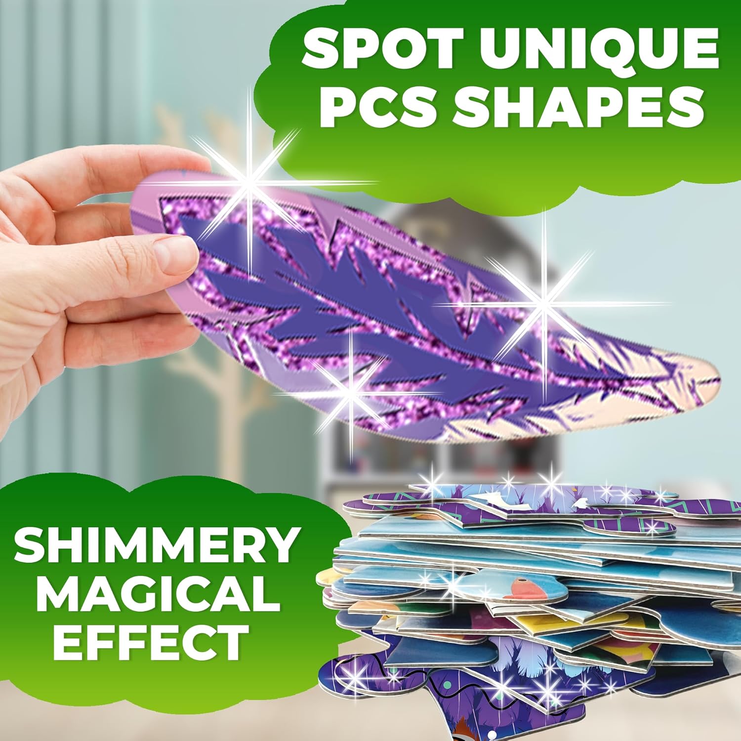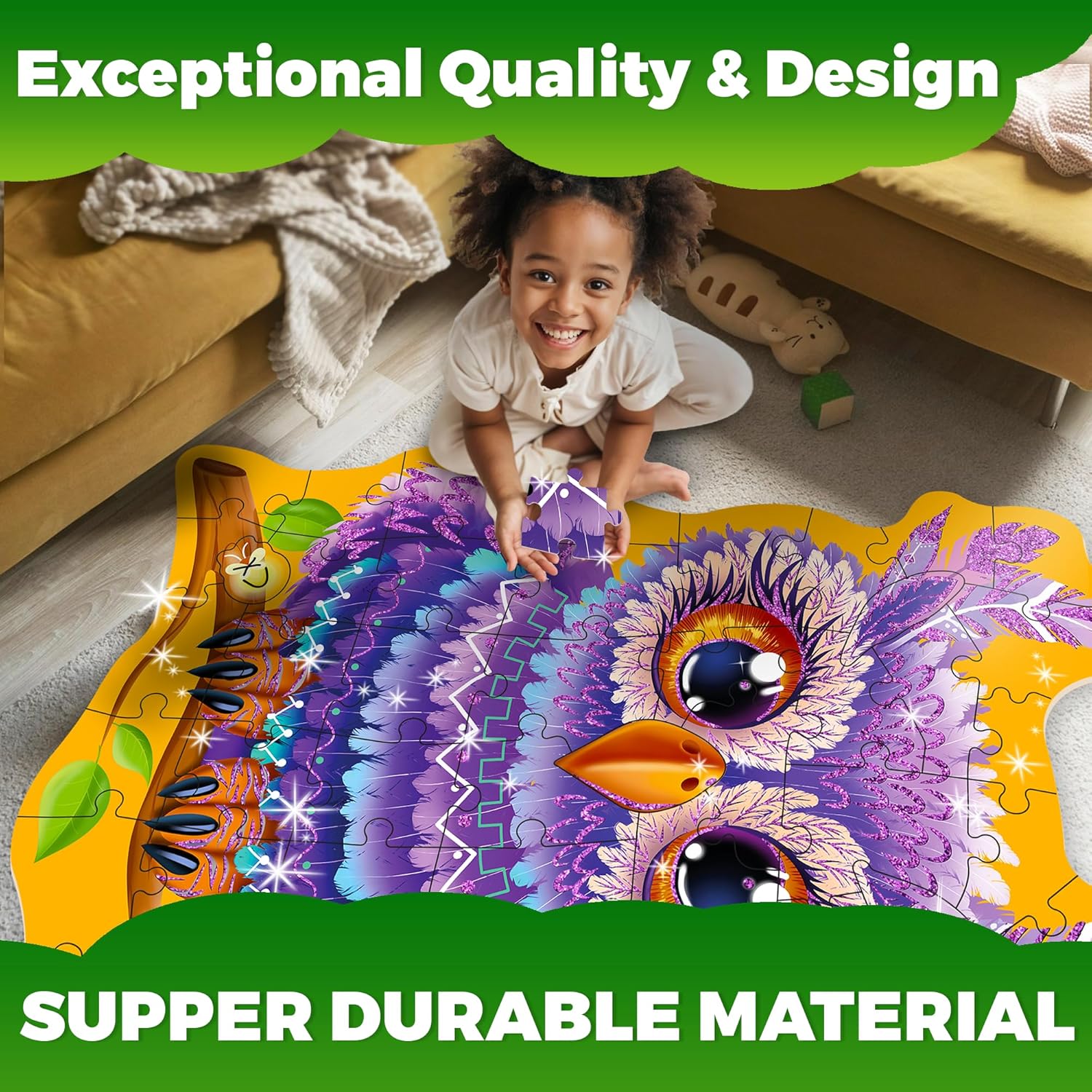 GIANT SHAPED PUZZLES FOR KIDS: Our floor puzzles for kids ages 3-5 are huge, measuring 2x3 feet; each oversized piece is uniquely shaped, with no two pieces alike, taking the experience of kids' puzzles ages 3-5 to a new level SHIMMERY MAGICAL EFFECT: Each toddler puzzle features a shimmery layer that glimmers as kids play; this magical effect brings the illustrations to life, making this owl puzzle as special and irresistible as other animal puzzles for toddlers 3-5 are SPOT UNIQUE PCS SHAPES: QUOKKA boxes offer not only around 48-piece puzzles for kids with large, irregularly shaped pieces for extra challenge, but also exclusive object-shaped pieces hidden within, making them truly unique as puzzles for 3-year-olds EXTRA THICK CARDBOARD: Made with exclusively high-quality materials, our floor puzzles for kids ages 2-4 and up are durable and long-lasting; Thick sturdy large piece puzzles for kids are easy to grasp and assemble, resisting bending or tearing STUNNING GIFT BOX: shimmery puzzle for kids ages 4-6 comes in a beautifully designed box with secure magnetic closure that is perfect for birthdays,holidays,milestones; I'is a wonderful choice, same as other QUOKKA floor puzzles for kids ages 4-8 are