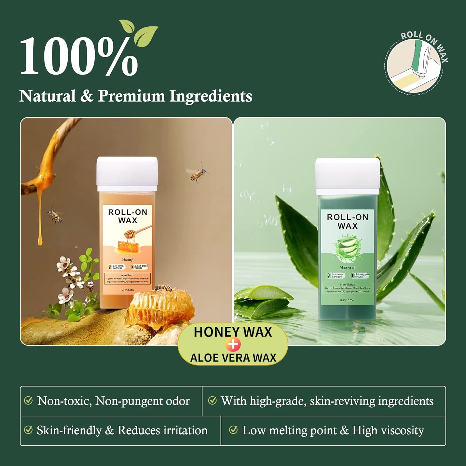 Lightweight and Portable: Elegant and mini design, the roller heater is easy to carry in your bag for waxing during travel and business trips. The unit is ergonomic and fits comfortably in your hand making operation easy and effortless. With 30 minutes of rapid heating, hair removal on both legs in just 15 minutes and up to 4 weeks of hair-free, soft, smooth skin, it's all worth the wait. Natural and Mild Ingredients: AVAII soft wax is made of natural mild ingredients and honey/aloe vera essential oil, non-irritating odor, is skin-friendly for sensitive skin and can reduce skin irritation and redness. Rich in skin-reviving ingredients, moisturizes skin while removing hair, leaving skin soft and smooth. What's more, the wax melts at low temperature which is friendly for people who are sensitive to heat. Save Money and Easy to Use: Two types of wax, full volume, easy to store for extended use. Just a thin layer has an excellent grasp on stubborn hair, effectively removing hair from the roots. No spatula or brush needed, clean and hygienic, no dripping and no mess. Just a few simple steps to complete the whole operation, you can enjoy professional salon quality smoothness at home and save the trip to the beauty shop! All-In-One Wax Roller Kit: AVAII professional roller wax kit includes everything you need for hair removal, suitable for personal and home use - 1 mini roller heater, 1 aloe & 1 honey wax, 100 large & 50 small wax strips, 10 calming oil wipes, and User Guide. 2 sizes of wax paper are fit for full body waxing - legs, arms, chest, back, underarms, bikinis, facial, etc.