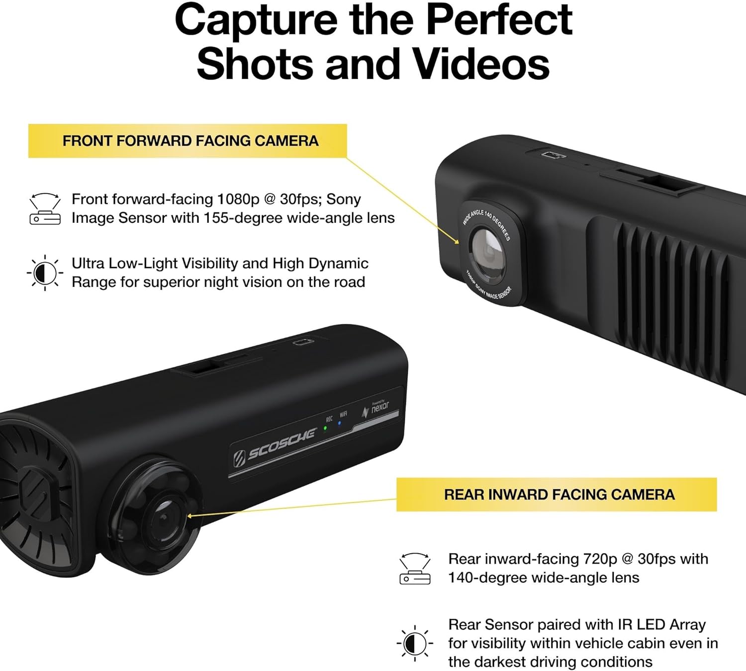 Complete Coverage: The Scosche NEXC2 Nexar-Powered dash cam ensures full security for your vehicle with high-quality front and rear cameras, capturing everything in 1080P Full HD from the 155-Degree front camera and 720P from the 140-Degree rear camera. Enhanced Night Vision: Capture clear and detailed footage even in low-light conditions with the Scosche NEXC2 dual dash cam's advanced camera lens for superior night vision capabilities. You won t miss a thing during road trips or daily commutes. Smart Collision Detection: The Scosche NEXC2 car camera's advanced G-Sensor technology detects collisions or impacts and automatically saves the footage to review later providing visual proof of damage or vandalism done to your vehicle while you are away. Seamless Integration: With the Nexar dash cam app, your footage is automatically recorded and saved to your phone, providing wireless convenience and ease of access. Enjoy FREE Nexar cloud storage for important event and trip data recording access. Easy Incident Reporting: Instantly report video evidence of a crash (speed, direction of travel, license plates and force of impact) directly to your insurance company using the Nexar app. NEXC2 ensures you can quickly share critical incident information.