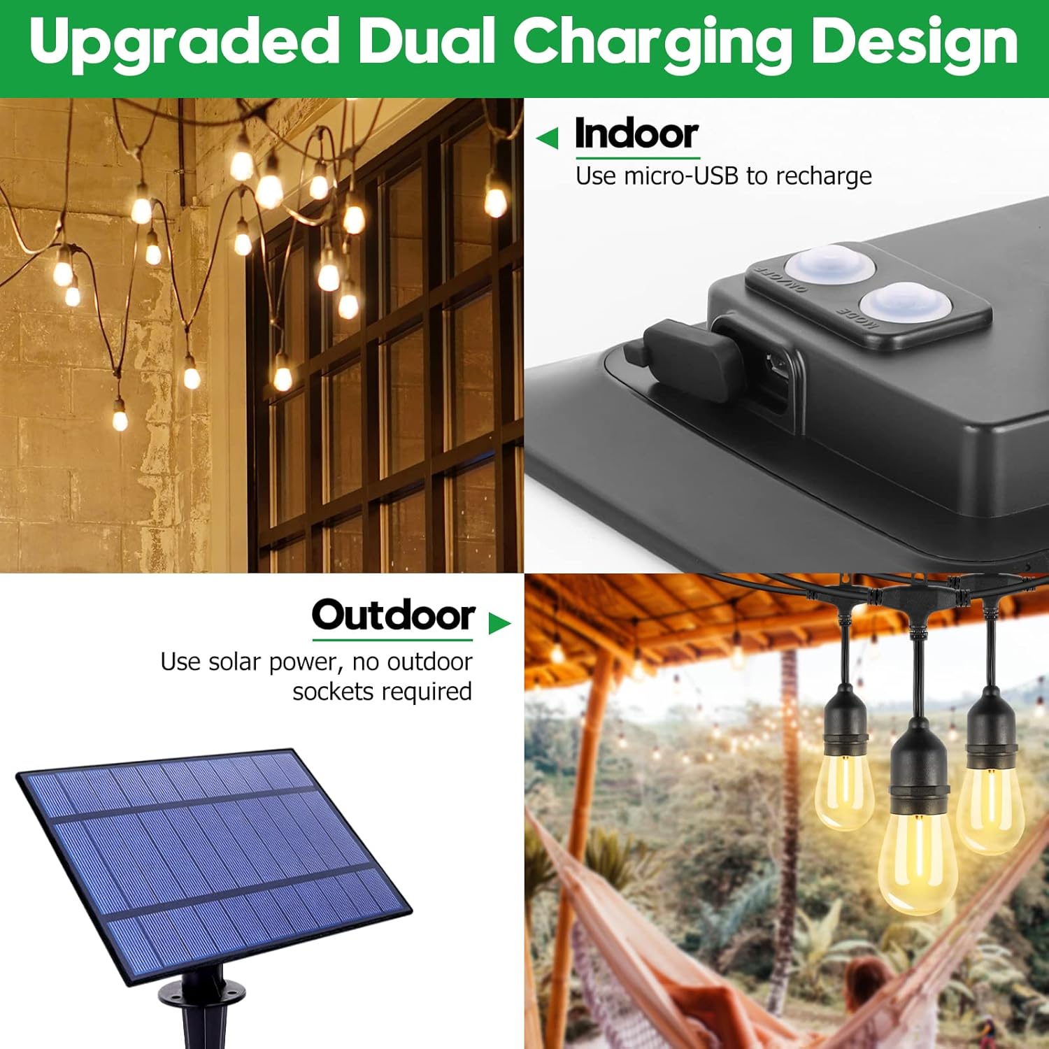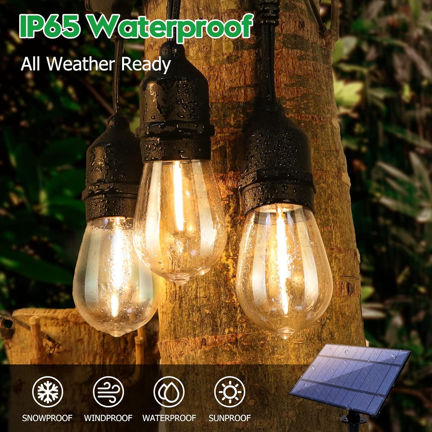Excellent Solar String Lights -- The whole outdoor string lights are 35FT in length, equipped with 11 shatterproof S14 bulbs (1 spare) and 1 solar panel. 5 levels of adjustable brightness, light up your life. The solar outside lights will automatically turn on in the dark and off during the day. IP65 Commercial Grade Waterproof -- The solar-powered string light can withstand low-pressure spray from any angle, as well as high-intensity weather conditions such as rain, high temperatures, snow, and hail. Its normal service life spans up to 20,000 hours (approximately 2.5 years). Upgraded Solar Panel & USB Charging Options -- This patio light features a high-efficiency, detachable solar panel and USB charging port. Both methods can be fully charged within 6-8 hours and provide up to 8 hours of continuous use when fully charged. In the event of cloudy or rainy weather, the solar panel can be conveniently recharged using the included USB cable. Easy to Use in Multi-Occasion -- With the included clips and stakes, the solar panel can be placed in almost any location. The 3 lighting modes (steady/breath/flash) and 2700K soft white light create a comfortable and romantic atmosphere, making it perfect for patios, gardens, food trucks, bistros, family reunions, birthday parties, weddings and BBQ parties. Satifying Service -- Our solar patio lights undergo meticulous manufacturing and rigorous testing. We are dedicated to providing exceptional customer service. Please don't hesitate to contact us if you have any inquiries.