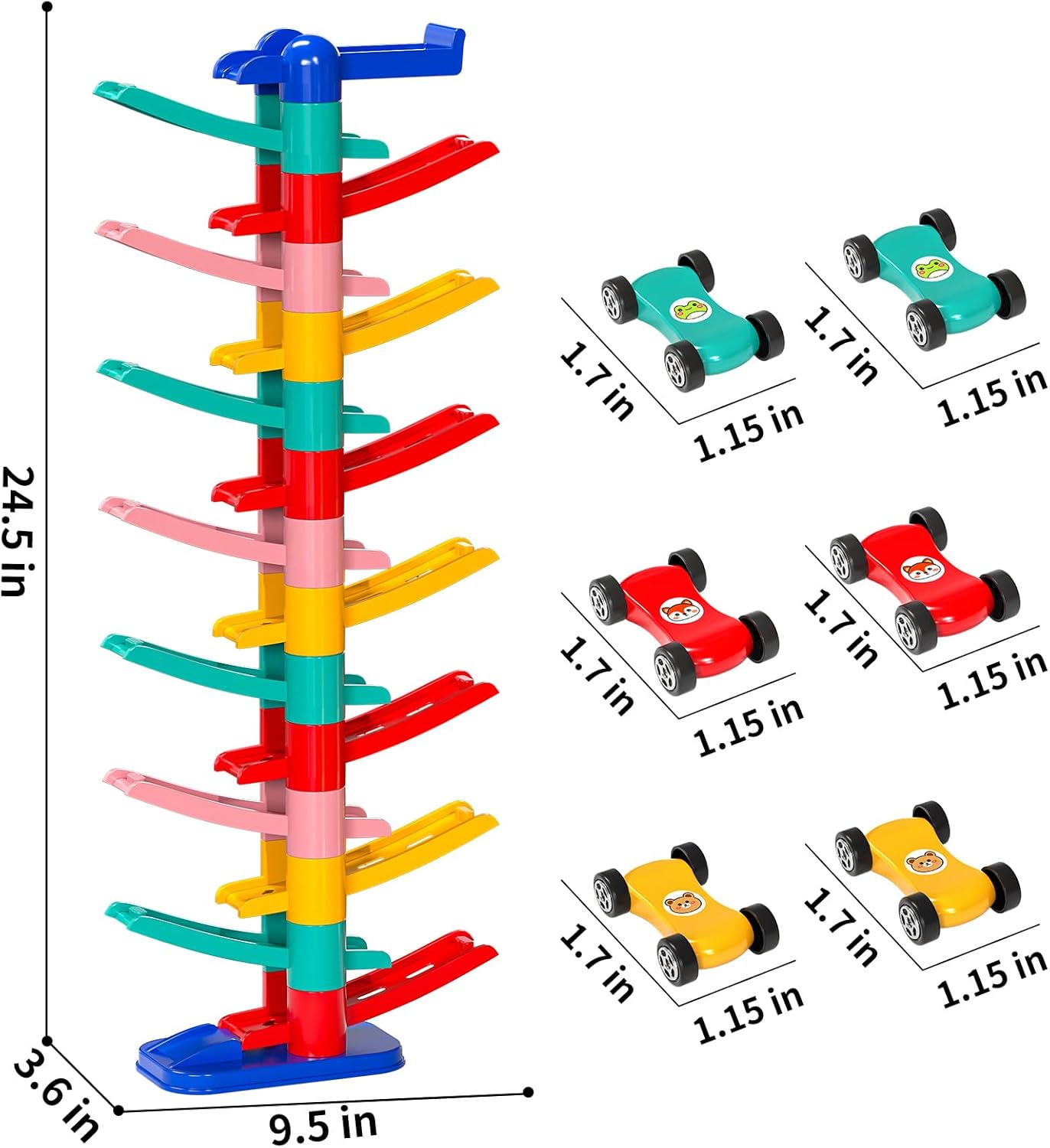 Car Ramp Toy for kids ages 2-4: The car toy set(9.5x3.6x24.5in) includes 14 ramps(red, yellow, green and pink), 2 top parking lots, 2 basal plates and 6 small cars with cute animal sticker. A little like roller coaster car toys for toddlers 1-3 and babies Racing Glider Game: The car ramp toy for babies of 18-24 months can be easily assembled into 1 or 2 sets of car race track. Just push the small toy cars, and the little cars for kids set off from the top parking lot and then slides down smoothly for fun More Way to Play: The wheels of the trolley are smooth, that can move smoothly between the toy ramps. Toys for 3+ year old boys and toys for babies 12-18 months and can push the track playset go forward and backward to practice visual tracking ability Learning through Playing: The toy vehicles for toddlers 1-3 come in different bright colors, so that children of 3 4 5 6 7 8 9 years old learn to recognize colors and numbers. Kids can play the cars toddler with parents to enjoy parent-child interaction Gifts for Toddler Cars Toys: The kids' play cars are suitable for kids to play, indoor or outdoor activity for kids. The developmental toys can be gifts for toys for 3+ year old boys and girls on holiday, such as Children's day, Christmas, Halloween, etc