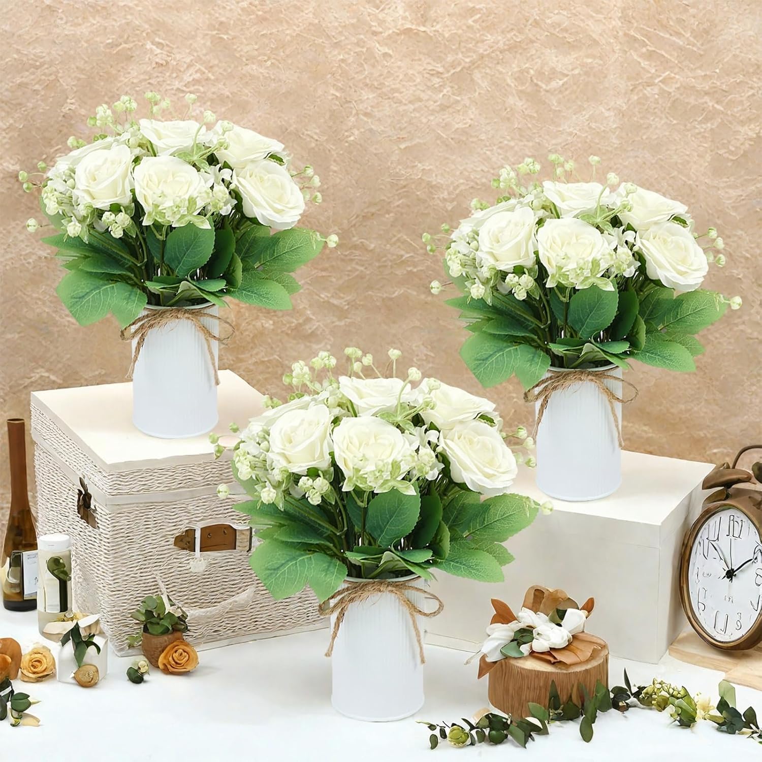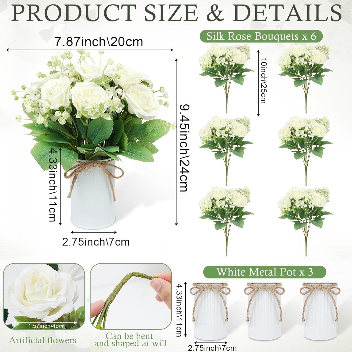 Silk Plastic Flower & Galvanized Tin Pots What You Get You'll get the set of 3 dining table centerpieces included 6 ivory fake rose bouquets and 3 metal flower pots .These faux flower centerpieces with rich flowers and a high degree of simulation make people feel warm and romantic! Medium Flower Arrangement for Table Fake flowers centerpiece arrangement height approx : 10 inch/25 cm; flower pots height approx : 4.3 inch/11 cm ; they're larger than most fake desk plants and perfect size for elegant table centerpiece, shelf decor or small spaces. Durable & No Maintenance : Ivory flower arrangements are made of high-quality silk & plastic, non-toxic and harmless, realistic and elegant, well made and vibrantly colored; metal pots are made of rustic galvanized tin, resistant to breakage and rust. Cute artificial rose material is made of high-quality silk , no daily care, always keep vibrant and fresh. Multiple Decorative Uses : Table centerpieces flower for wedding can be displayed on dining table, coffee table, office desk, nightstand, shelves, windowsill, fireplace mantel, or bookcase to make any space refreshingly inviting. This multi functional table decoration set has an exquisite appearance, whether your interior decoration is Bohemian, country, farmhouse, minimalist, modern style, etc. our faux plants flower can match perfectly. Customizable Small Arrangement : Personalize your space effortlessly with silk flowers centerpieces decor. Upon receiving your artificial bouquet flowers, simply unroll the stems to achieve fullness. The plastic floral stem can be bent and trimmed to your preferred size at will. Great Gift Ideas Cute table flower centerpieces for dining room is perfect for wedding, holiday, birthday, baby shower gifts, anniversary, Easter, Mother s Day gift, Father s Day, housewarming, new home gift, any holiday to congratulate.